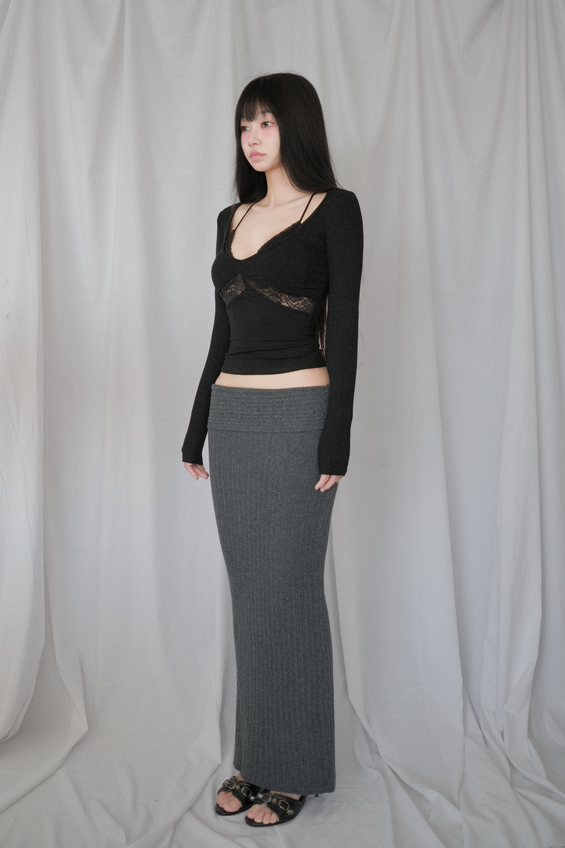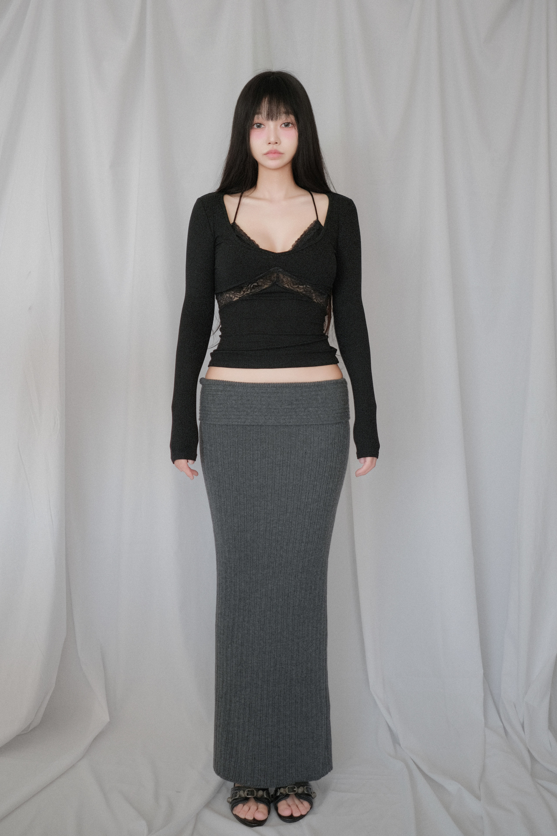 탄탄하고 밀도 높은 도톰한 니트 소재 롱 스커트